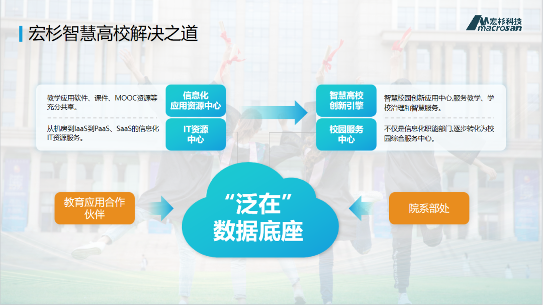 作为一站式数据存储专家,面对智慧教育与新质生产力融合的新机遇,宏杉科技通过集成SAN、分布式、备份、云及超融合等产品,着力打造“泛在”数据底座,以解决校园数据割裂、应用独立、建设分散、缺乏弹性等问题,为教务、财务、一卡通、人事、科研、后勤等核心业务系统提供强有力的数据支撑,推动产学研工创一体化。