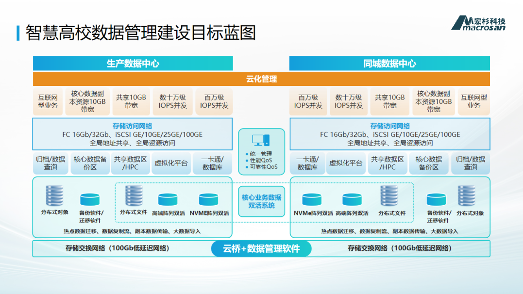 为保障山东大学财务系统、校园卡、云平台等关键业务的平稳安全运行,宏杉科技有针对性地提供包含集中式存储、分布式存储、数据保护等在内的全套数据存储解决方案。该方案以数据交换平台和存储双活为核心基础架构,搭建了一个全面智能的数据存储与管理平台,打破了数据壁垒,实现了互联互通、资源共享、开放融合;该方案通过构建统一的存储数据池,按需分配,实现了统一运维管理和资源统一调度使用,为教学管理、智慧教学、校园大数据、智能应用等提供数据存储服务。