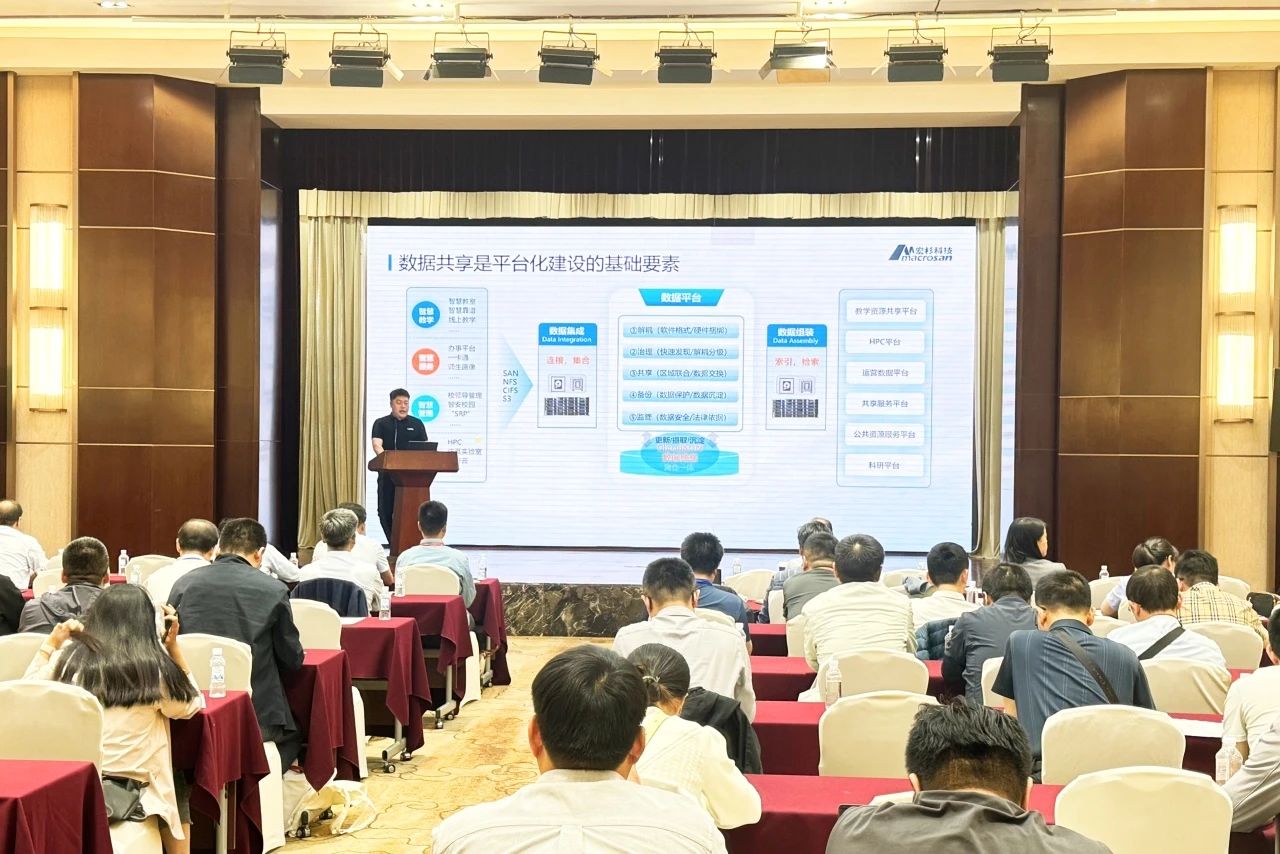 会上,宏杉科技行业解决方案部部长薛亮发表题为“先进存力夯实智慧校园数据底座”的专题演讲。薛亮强调,信息化建设对于推动教育现代化具有举足轻重的作用,当前,教育正向以平台为主的资源共享模式转变,而数据共享则是平台化建设的基础要素。