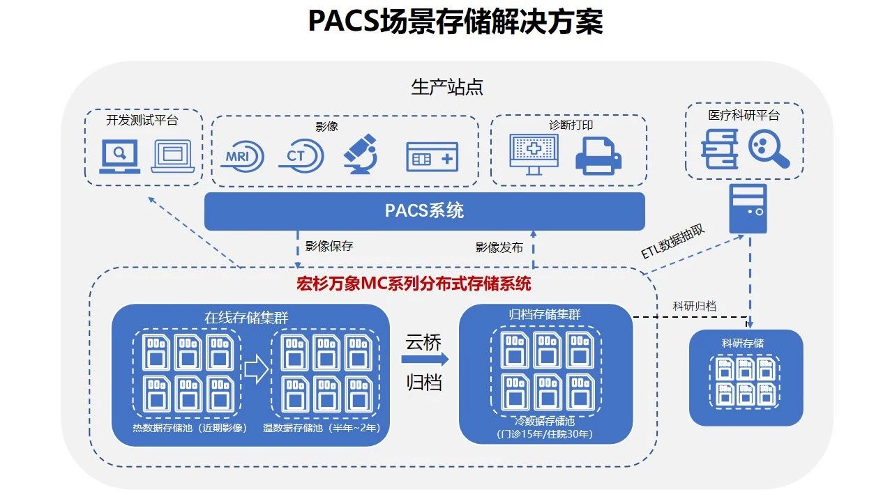 为实现医院数字化革新,宏杉科技针对医院移动访问、区域会诊、影像分析等场景下的数据存储需求提供的医疗影像数据分级存储解决方案,可满足从影像保存、影像调用到影像归档的全流程数据存储与管理需求,也为多院区、第三方检验等数据分发场景提供强大的存储支撑。