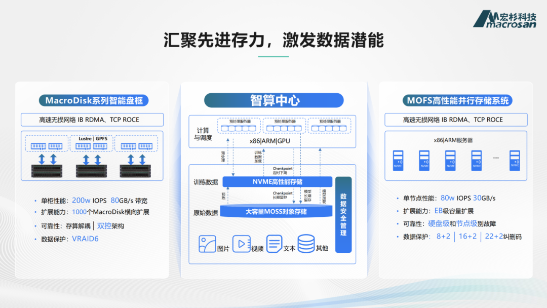 此外,在AI大模型训练过程中,用户的核心诉求是提升GPU资源利用率,这对存储系统性能要求极高。为实现训练数据快速加载、GPU无等待、Checkpoint(AI大模型训练过程中定期保存的模型状态快照)快速保存与恢复的目标,通常需要存储系统提供数百GB/s的带宽,以及千万级的IOPS处理能力。对此,李强介绍道:“宏杉科技以MacroDisk智能盘柜与MC27000-MOFS高性能分布式并行存储系统为核心,打造了智算中心AI存储解决方案,能够为AI大模型的深度研发提供强大的存储支持。”