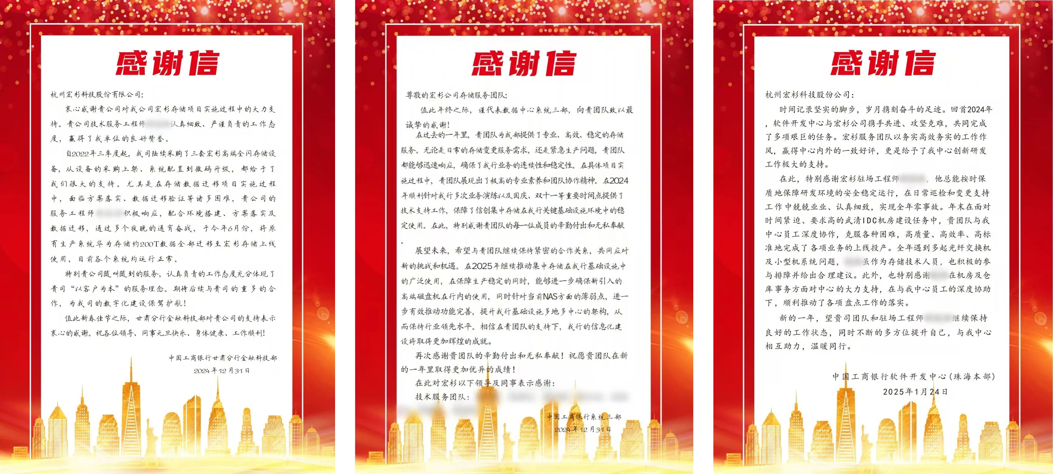 近日,宏杉科技接连收到来自中国工商银行的多封感谢信。信中,中国工商银行对宏杉科技提供的专业、高效、可靠的存储服务给予高度认可,并对服务团队在项目期间的辛勤付出表达了感谢。同时,中国工商银行表示,期待与宏杉科技继续保持紧密合作,共同为银行的信息化建设筑牢存储底座。