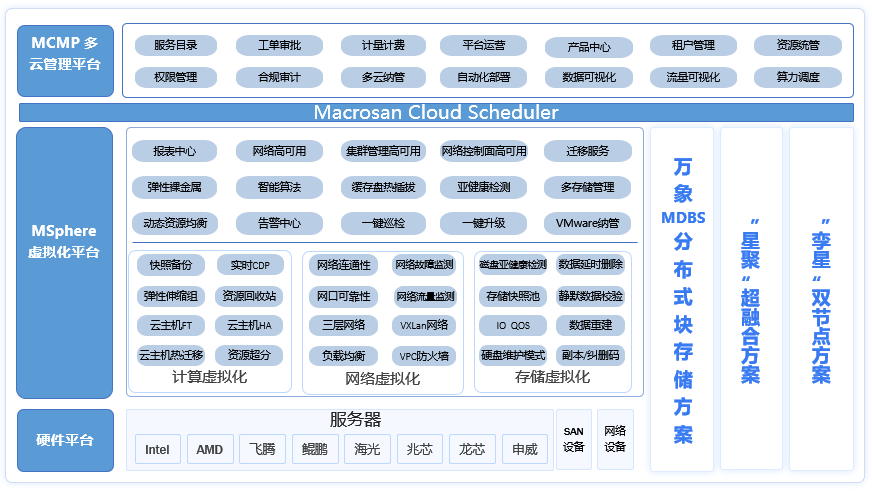 宏杉采用自研云架构,组件之间采用100%全解耦方式,具备宏杉多云管理平台MCMP、宏杉虚拟化MSphere、宏杉分布式块存储MDBS等产品组件,任意组合可提供包含虚拟化、超融合、私有云、分布式块存储等不用维度的解决方案,前期超融合模式后期也支持向私有云架构拆分扩展。